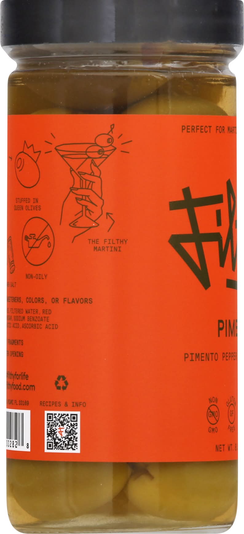 Olives, Pimento • Brand: Filthy • vegan, gluten-free, GMO-free • Filthy Food, Miami,FL,33169 • Packaging: Reusable