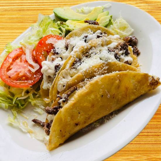 Three handmade tortillas with Oaxaca cheese and meat. Lettuce, tomato, avocado, Mexican crema, and cheese on the inside