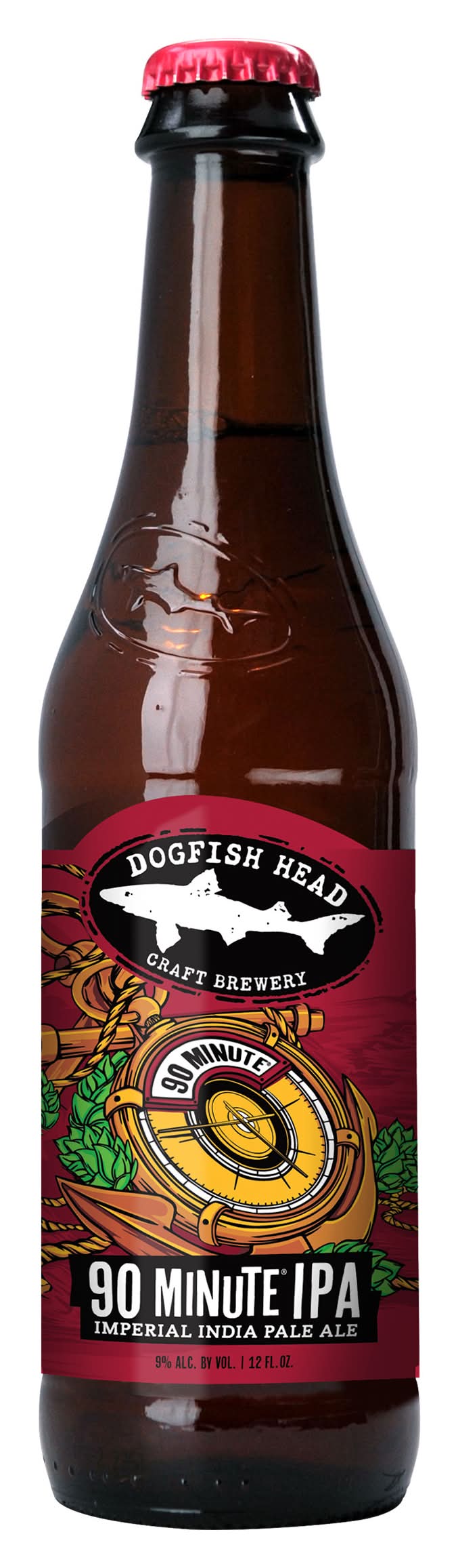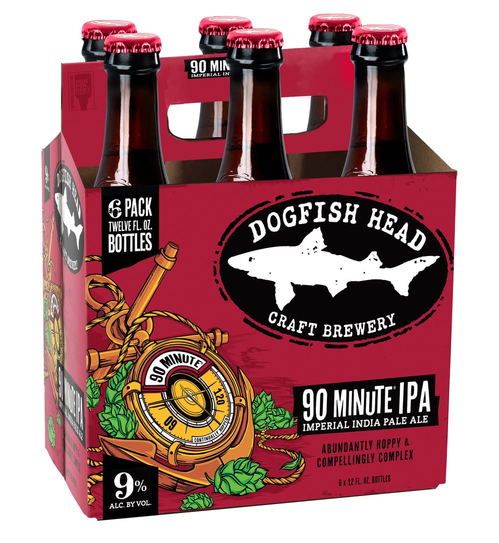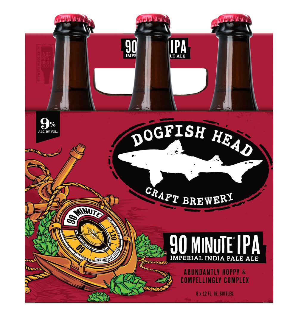 What you have here is the only Imperial IPA in America inspired by a bowl of soup and a thrift store football game... Continual hopping provides a beautiful balance to our Imperial IPA -allowing us to add a foolhardy amount of hops throughout the boil without making 90 Minute crushingly bitter. • Pack size: 6 • Alcohol by volume: 9% • Dogfish Head Craft Brewery, Milton,DE