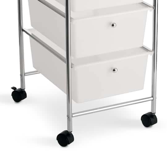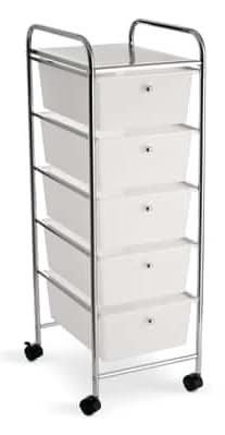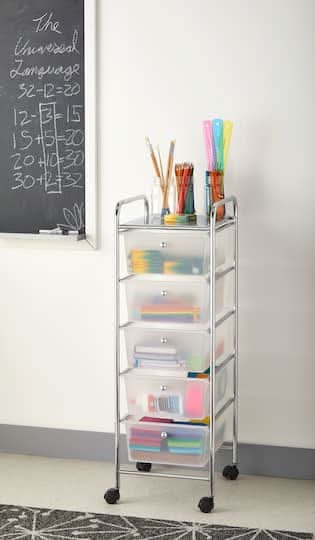 Find the 5 Drawer Rolling Cart by Simply Tidy at Michaels. Perfect for storing your classroom materials, crafting supplies, office essentials and more, this cart allows you to move the materials you need safely from room to room while keeping everything at hand and easy to reach. Available in multiple colors . Maximum 4.4 lb. (2 kg) load limit per drawer . Two locking wheels for safety . Drawer stops included . Assembly required . Metal and plastic Color: Clear
