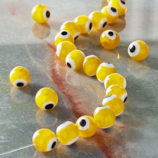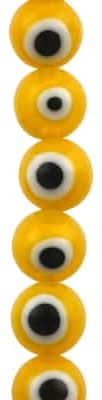 These striking round lampwork glass beads with an evil eye design will add eye-catching appeal to your accessory creations. On their own or mixed with complimentary stones and charms, these beads will make lovely necklaces, bracelets and earrings and are also a wonderful accent for home decor projects and other crafts. Available in multiple colors . 8 mm bead size . 7" (17.7 cm) string length . Round lampwork evil eye Color: Yellow