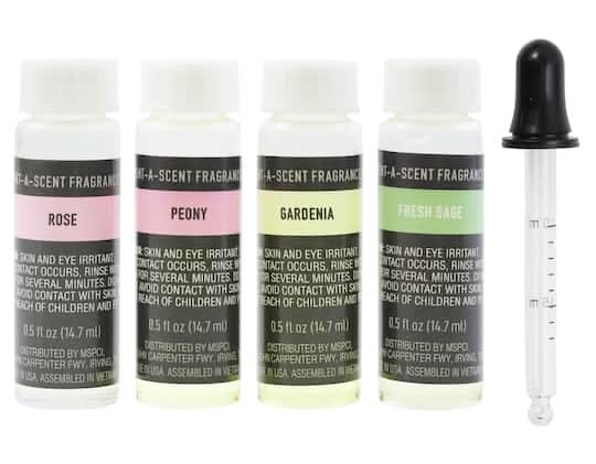 Find the Invent-a-Scent Garden Candle Fragrance Oil Set by Make Market at Michaels. Make handcrafted candles scented with aromas of a spring garden in bloom using this oil set. With an assortment of four oils and a dropper for mixing included, this set lets you blend scents to add your own unique touch to candles for special gifts and seasonal home decor accents. Includes assorted scents. Fully concentrated. Phthalate-free. Fragrances - Rose, Peony, Gardenia, Fresh Sage.
