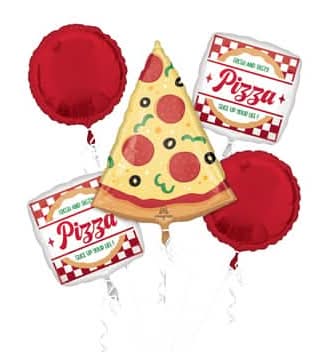 Purchase the Pizza Party 5-Piece Foil Balloon Bouquet at Michaels. No party is complete without a Pizza Party Balloon Boquet! This set of five balloons includes two pizza box balloons, two red circle balloons and one pizza slice balloon that will lighten up the room with fun. Red and yellow. 5 balloons. Requires helium or air inflation. Metalized polyester film. 2 Pizza Balloons (18"/45.7 cm)2 Red Circle Balloons (18"/45.7 cm). 2 Red Circle Balloons (18"/45.7 cm)1 Pizza Slice Balloon (29"/73.6 cm). INFLATED Pizza Party 5-Piece Foil Balloon Bouquet