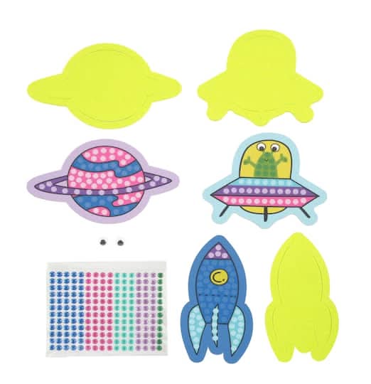 Perfect for rainy day craft time, this kit contains everything needed for an afternoon of fun with three finished projects ready to display on their bedroom wall. Space theme. 5" x 6" x 0.6" (12.7cm x 15.24cm x 1.52cm) package size. Makes 3 projects. 192 adhesive gems3 cardboard shapes. 3 cardboard shapes3 glitter foam stickers Color: Multicolor