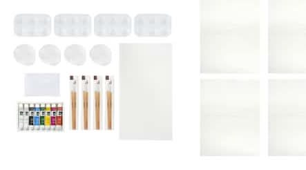 You and up to three of your friends will have a blast making a lovely landscape with the included pre-printed canvases, paints and brushes. design . 11" x 14" (27.9cm x 35.5cm) canvas size . Makes 4 art pieces . Care instructions on package . 4 pre-printed canvas panels with easels 32 acrylic tubes (4 sets of 8 tubes) . 32 acrylic tubes (4 sets of 8 tubes) 4 palettes Size: 11 x 14 in