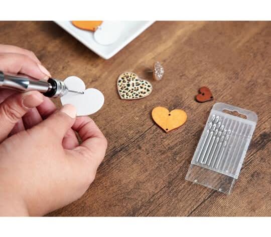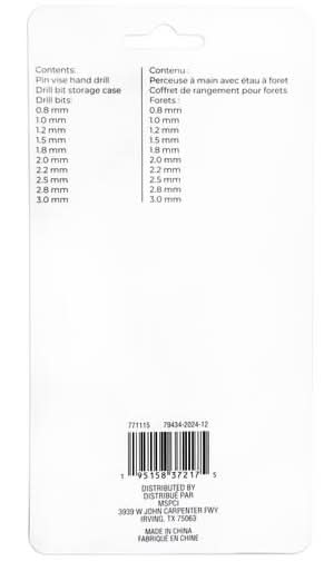 Find the Pin Vise Hand Drill with Bits by Bead Landing at Michaels. With a wide assortment of bits included, this drill lets you easily add tiny holes to wood, clay and other materials to easily add them to beautiful handmade earrings, necklaces and more! Includes assorted drill sizes. 12 pieces. Aluminum alloy and steel. Pin vise hand drillDrill bit storage case. Drill bit storage case10 drill bits (0.8 mm, 1 mm, 1.2 mm, 1.5 mm, 1.8 mm, 2 mm, 2.2 mm, 2.5 mm, 2.8 mm and 3 mm)