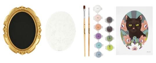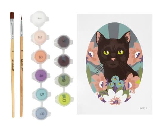 Complete with brushes, numbered paint pots, a pre-printed canvas sheet and an ornate decorative frame with a magnet and easel for display, this kit has everything needed to paint a darling black cat emerging from the flowers. Cat with Florals design. 4" x 5.6" (10.3cm x 14.3cm) canvas sheet size. 5.3" x 6.8" (13.5cm x 17.5cm) frame size. 115 numbered sections.