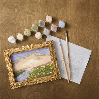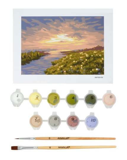 Buy the Sunset Field Paint-by-Number Framed Mini Kit by Artist's Loft at Michaels. Complete with brushes, numbered paint pots, a pre-printed canvas sheet and an ornate decorative frame with a magnet and easel for display, this kit has everything needed to paint a serene sunset over a field and a stream. Sunset Field design. 5.6" x 4 (14.3cm x 10.3cm) canvas sheet size. 6.8" x 5.3" (17.5cm x 13.5cm) frame size. 213 numbered sections. Instruction sheet included. Conforms to ASTM D-4236