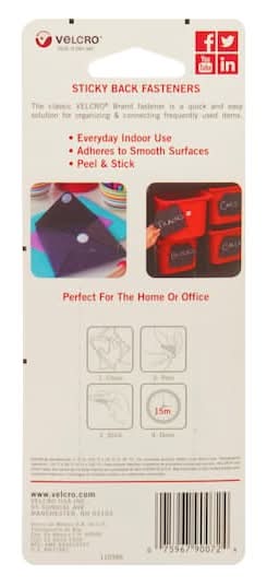 Purchase the VELCRO Brand Sticky Back Squares at Michaels. VELCRO Brand Sticky Back hook and loop fasteners deliver strong holding power. Simple peel and stick application. Available in multiple colors . 7/8" (2.2 cm) each square size . 12 sets of squares . SUITABLE FOR SMOOTH SURFACES: Hook and loop fastener adheres to most smooth surfaces; features a strong adhesive to organize at home, school, or office; no sewing, gluing or ironing required . STRONG AND SECURE HOLD: Creates a long-lasting bond that applies easily to smooth surfaces indoors including walls, glass, tile, plastic, metal and wood—ideal for everyday use –the possibilities are endless . SCHOOL SUPPLIES FOR TEACHERS AND EDUCATORS - Numerous applications to keep the classroom tidy - fasten items to desks and folders, stick nametags to back the back of chairs. Adhere your whiteboard erasers and markers to the board with our sticky back tape . VELCRO Brand Sticky Back Squares • Color: Black • Size: 7/8 In