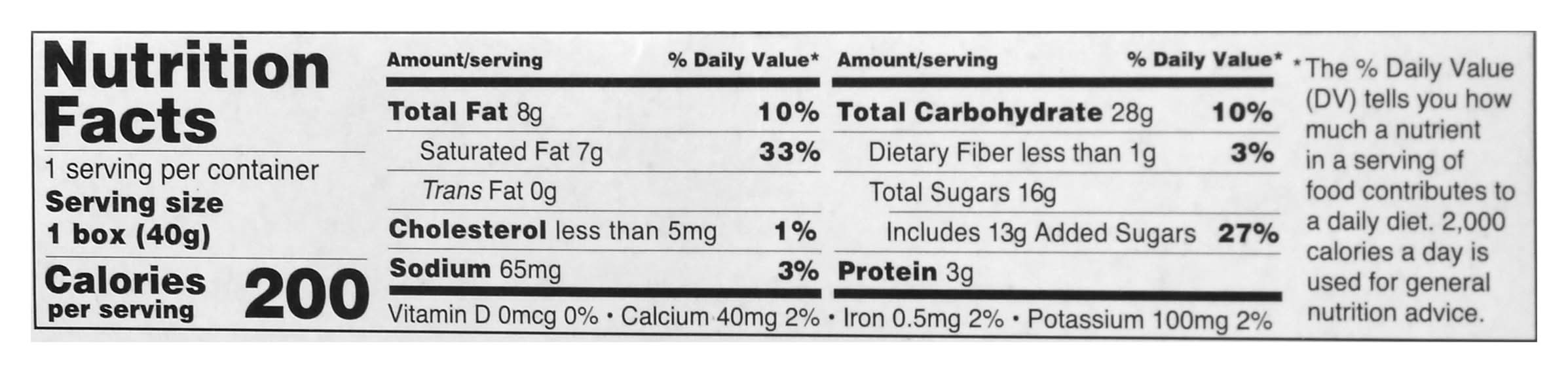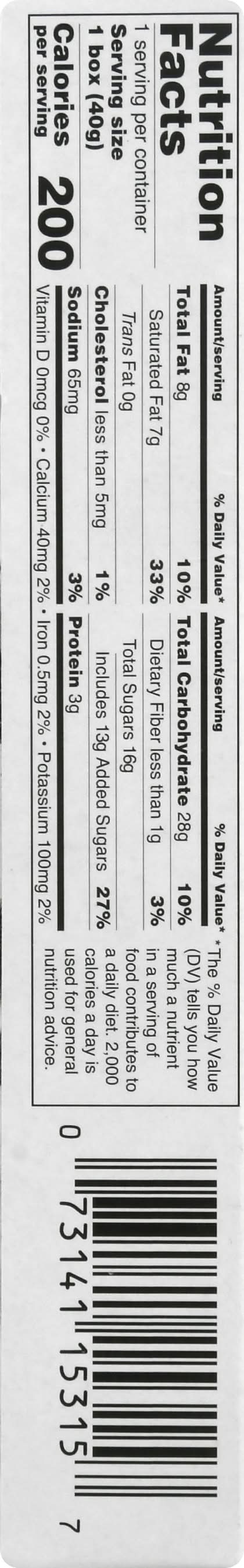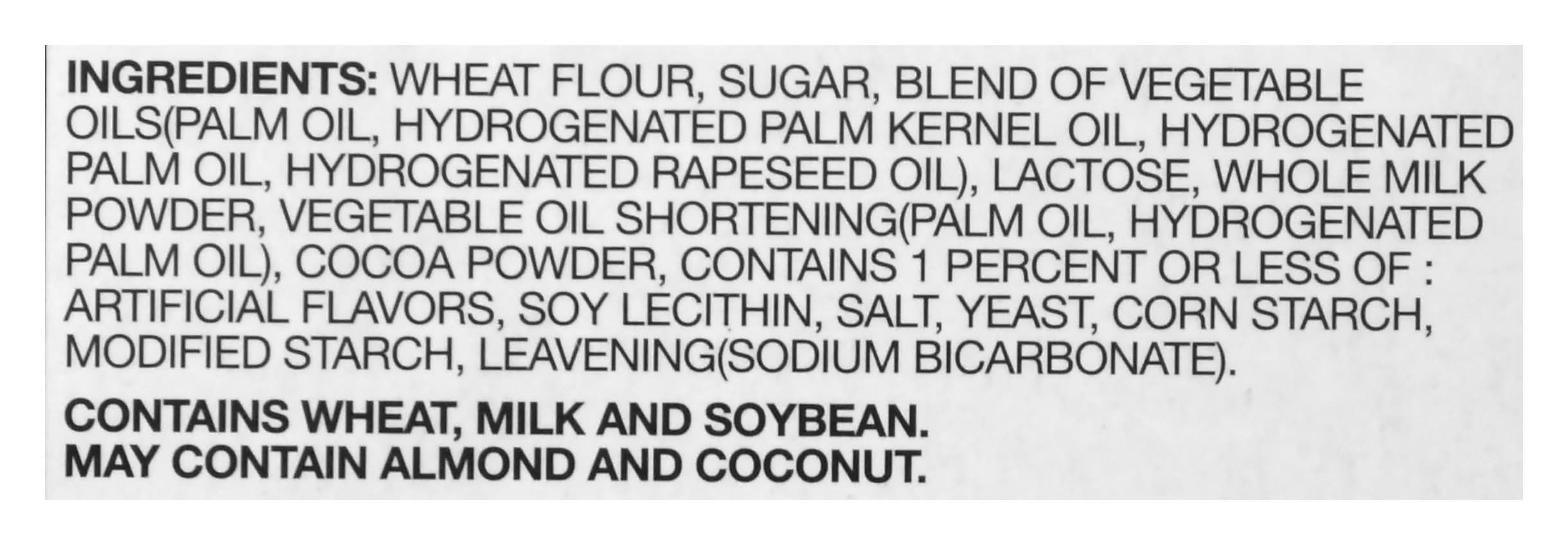 Ingredients: Wheat Flour, Sugar, Blend of Vegetable Oils(Palm Oil, Hydrogenated Palm Kernel Oil, Hydrogenated Palm Oil, Hydrogenated Rapeseed Oil), Lactose, Whole Milk Powder, Vegetable Oil Shortening(Palm Oil, Hydrogenated Palm Oil), Cocoa Powder, Contains 1 Percent or Less of : Artificial Flavors, Soy Lecithin, Salt, Yeast, Corn Starch, Modified Starch, Leavening(Sodium Bicarbonate) Contains: Wheat, Milk, Soybeans, Tree Nuts, Almond, Coconut