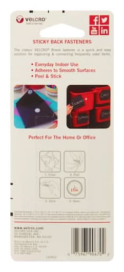 Purchase the VELCRO Brand Sticky Back Coins & Squares Value Pack at Michaels. VELCRO Brand Sticky Back hook and loop fasteners deliver strong holding power. Simple peel and stick application. Available in multiple colors . SUITABLE FOR SMOOTH SURFACES: Hook and loop fastener adheres to most smooth surfaces; features a strong adhesive to organize at home, school, or office; no sewing, gluing or ironing required . STRONG AND SECURE HOLD: Creates a long-lasting bond that applies easily to smooth surfaces indoors including walls, glass, tile, plastic, metal and wood—ideal for everyday use –the possibilities are endless . SUITABLE FOR SMOOTH SURFACES: Sticky Back Strips adhere to most smooth surfaces; features a strong adhesive to organize at home, school, or office; no sewing, gluing or ironing required . STRONG AND SECURE HOLD: Creates a long-lasting bond that applies easily to walls, glass, tile, plastic, metal and wood—ideal for everyday use –the possibilities are endless . PRESS AND SET COINS: Simple to use pre-cut coins and rectangles, just clean surface, peel off the protective backing and firmly press against the surface; allow adhesive bond to set for 24 hours to achieve full strength . VELCRO Brand Sticky Back Coins & Squares Value Pack Color: Black