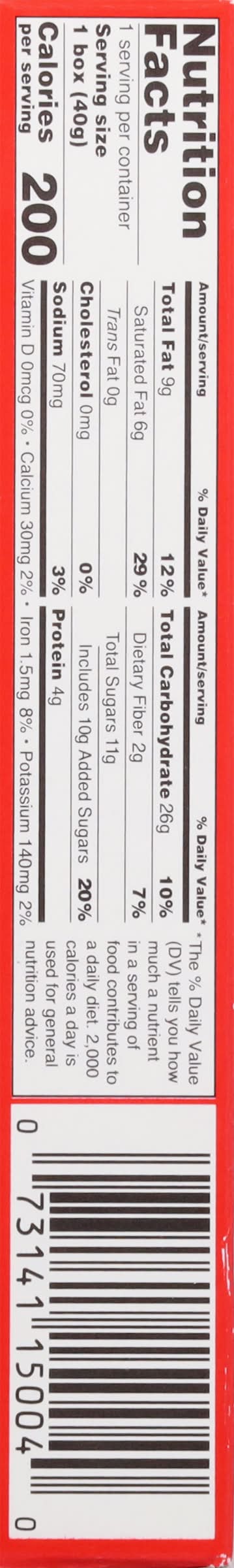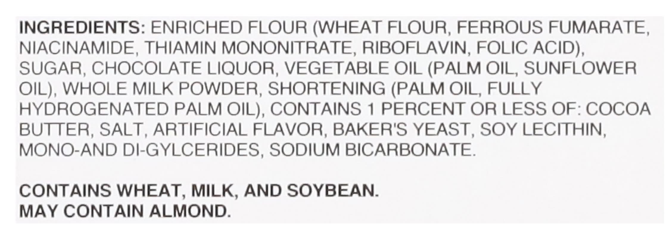 Ingredients: Enriched Flour (Wheat Flour, Ferrous Fumarate, Niacinamide, Thiamin Mononitrate, Riboflavin, Folic Acid), Sugar, Chocolate Liquor, Vegetable Oil (Palm Oil, Sunflower Oil), Whole Milk Powder, Shortening (Palm Oil, Fully Hydrogenated Palm Oil), Contains 1 Percent or Less of: Cocoa Butter, Salt, Artificial Flavor, Baker's Yeast, Soy Lecithin, Mono-and Di-Gylcerides, Sodium Bicarbonate. Contains: Wheat, Milk, Soybeans, Tree Nuts, Almonds