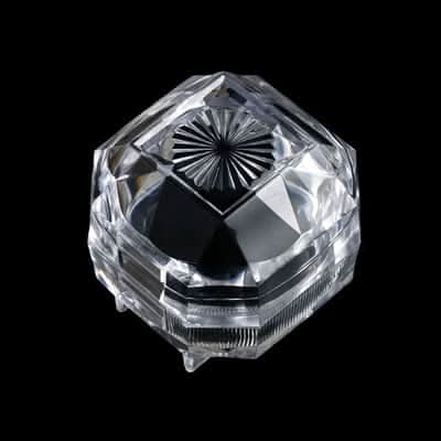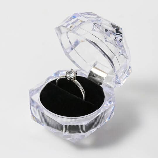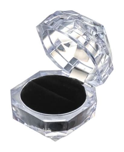 Featuring a clear acrylic frame that looks like a gemstone and matte black fabric to hold the ring, this ring box is a luxurious way to display a treasured ring. You can store your ring in the box and display it on a dressing table, vanity or dresser.. 1.89" (4.8 cm) ring box size . 1 piece . Acrylic, polystyrene and velvet Color: Clear