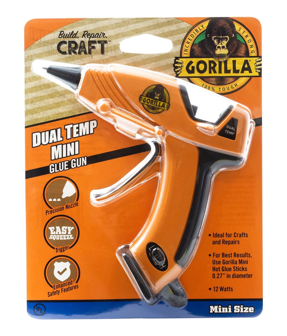 The Gorilla Dual Temp Mini Glue Gun is an ideal tool for crafts and repairs. It is light weight, with a comfort grip and a built-in stand making it easy to use. The easy squeeze trigger and long insulated nozzle allow a precise application on whatever project you are working on. Color: Orange