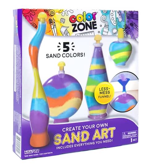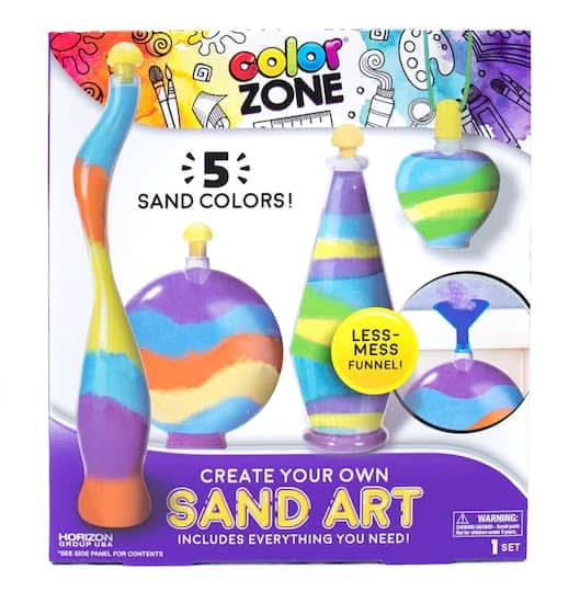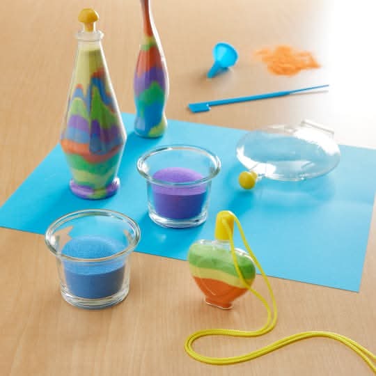 This kit includes everything you need to create colorful sand art projects! Makes a great gift for birthday parties and holidays. 5 colors of sand (green, yellow, orange, purple and blue) . For ages 6 and up . Packaging may vary. 5 bags of colored sand (4 oz. each) 3 sand art bottles 1 sand art pendant . 1 design tool . Color: Assorted