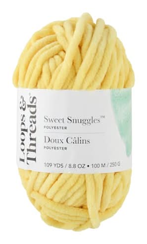 Find the Sweet Snuggles Yarn by Loops & Threads at Michaels. Use this soft yarn for your upcoming crafting projects to create afghans, sweaters, hats and scarves. Weight: 7 - Jumbo . Contents: 100% polyester . Skein Weight:. Yardage: 109 yd. / 100 m . Knitting Gauge: 6 sts - 8 rows = 4" (10 cm) . Suggested Knitting Needle: 12.5 mm, US - 17 . Sweet Snuggles Yarn by Loops & Threads Color: Yellow