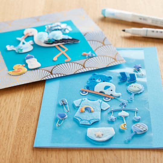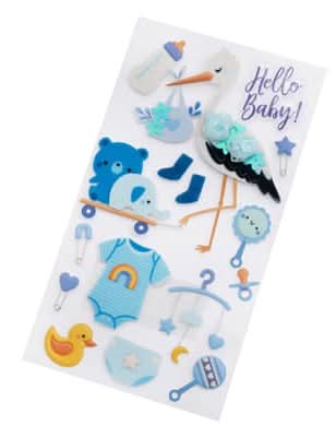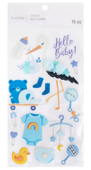 Embellish one-of-a-kind cards, scrapbook pages, planners and more with this fun assortment of dimensional stickers from Recollections. Perfect for adding eye-catching focal points and depth to your paper projects, this set of baby themed stickers is a great addition to your crafting collection. Baby boy themed stork design. 3.75" x 6.75" (9.53cm x 17.15cm) sheet size. 16 stickers. Layered PVC and paper with felt Size: 3.75x6.75 in