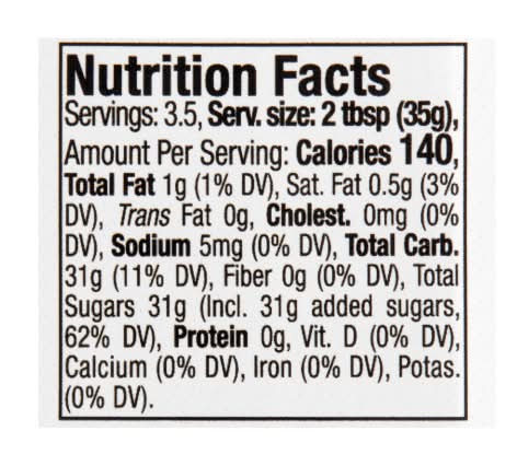 Ingredients: Sugar, Corn Syrup, Water, Palm Oil, Gum Tragacanth (Stabilizer), Natural & Artificial Flavors, Cellulose Gum (Thickener), Modified Corn Starch, Potassium Sorbate (Preservative), Glycerine (Humectant), Acetic Acid (Preservative), Yellow 5, Blue 1