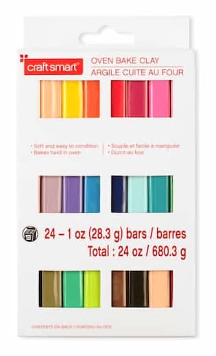 Shop for . Oven-Bake Clay by Craft Smart at Michaels. A creative way to stretch your imagination, this clay remains soft and pliable until you bake it. Includes an assortment of colors . 1 oz. (28.3 g) each . 24 oz. (680.3 g) total package . . Soft and easy to condition . Conforms to ASTM-D 4236 Color: Assorted