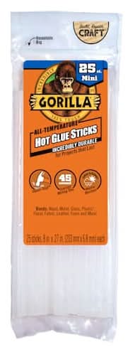 These mini hot glue sticks from Gorilla are weather-resistant and impact tough, making them incredibly durable so that you can create projects that last. Made to work with all glue gun temperatures, these sticks provide a strong hold on many surfaces including wood, metal, glass, plastic and leather. Clear. 8" x 0.27" (203mm x 6.8mm) each. 25 sticks. All temperature. 45 second extended working time. Color: Clear
