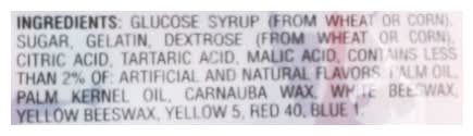 Ingredients: Glucose Syrup (from Wheat or Corn), Sugar, Gelatin, Dextrose (from Wheat or Corn), Citric Acid, Tartaric Acid, Malic Acid, Contains Less Than 2% of: Artificial and Natural Flavors, Palm Oil, Palm Kernel Oil, Carnauba Wax, White Beeswax, Yellow Beeswax, Yellow 5, Red 40. Blue 1 Contains: Wheat