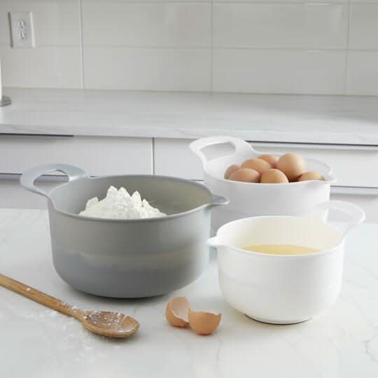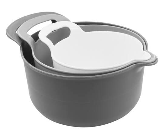 This bowl set is perfect for mixing ingredients. Each vessel is constructed with a spout that makes pouring batter mess-free and easy. 3 bowls. Food safe. Non-slip base. Polypropylene . 1.9 qt (1.79 l) bowl 3.4 qt (3.21 l) bowl 5 qt (4.73 l) bowl Color: Gray-white