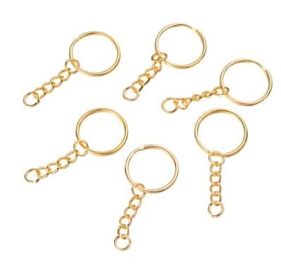 Great for pairing with charms, clay trinkets or little animal figurines, they feature a split ring design with attached chains. Use the finished pieces as key chains or as cute embellishments for backpacks, purses or satchels. • Color: Gold • Size: 25 mm