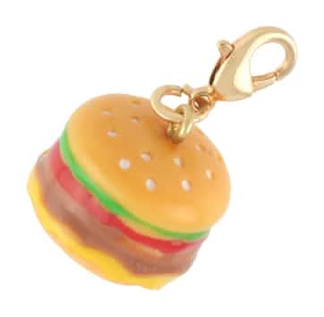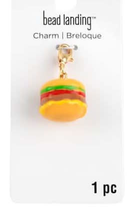 Purchase the Michaels. Add this burger charm to your charm bracelet or DIY necklace. You can coordinate with beads, spacers, and other food or beverage related charms to create a unique and fun design. Gold lobster clasp with multicolor burger charm . 18 mm . Nickel free . Zinc alloy, iron and enamel