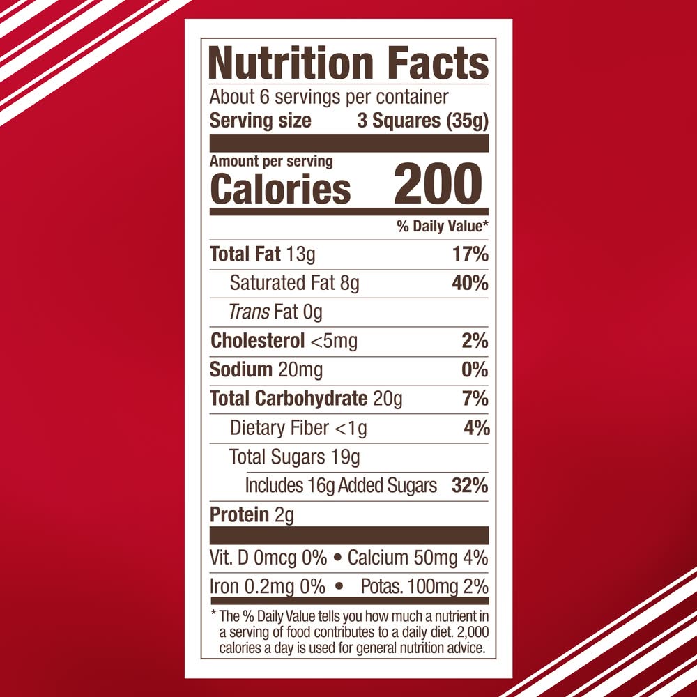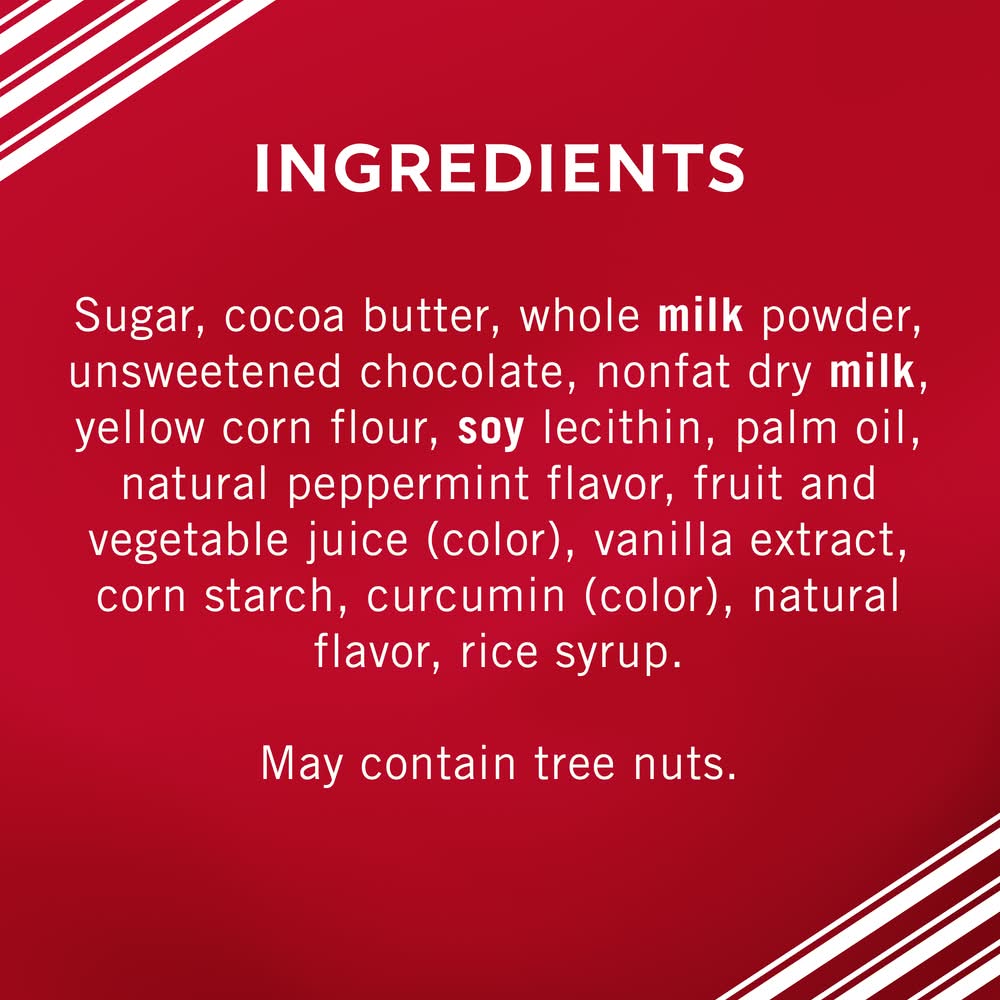 Ingredients: Ingredients: Sugar, cocoa butter, whole milk powder, unsweetened chocolate, nonfat dry milk, yellow corn flour, soy lecithin, palm oil, natural peppermint flavor, fruit and vegetable juice (color), vanilla extract, corn starch, curcumin (color), natural flavor, rice syrup. Contains: Soybeans, Milk, Tree Nuts