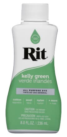 Rit Dye Liquid Kelly Green is a versatile and easy-to-use concentrated liquid dye that is non-toxic and pre-mixed. It is suitable for a variety of fabrics such as cotton, linen, silk, wool, rayon, and nylon, as well as non-fabric materials like wood, wicker, paper, and cork. This product is ideal for numerous creative projects, including rejuvenating faded clothing, changing the color of apparel, shoes, and accessories, and coordinating home décor. It allows for the creation of unique patterns such as ombré, tie-dye, dip-dyed, marbled, and shibori. The dye can be applied using different methods, including a washing machine, plastic container, or stainless-steel sink, and is available in multiple colors. Color: Kelly green
