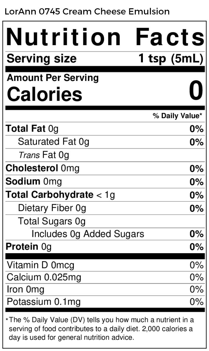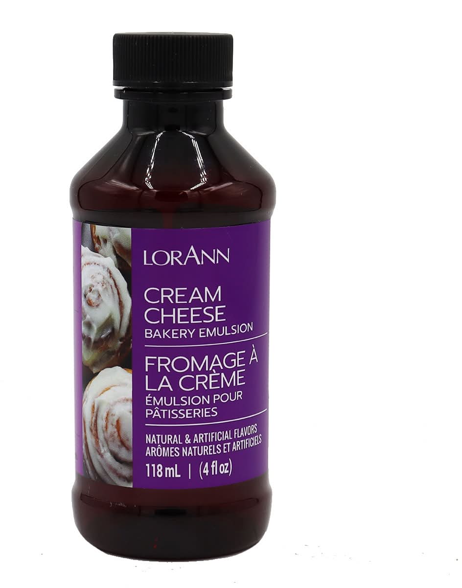 Give your baked treats a professional flavor with this Lor Ann Oils Bakery Emulsion. . Cream cheese flavor. Water based and gluten free. • Flavor: Cream cheese • LorAnn Oils Inc., 4518 Aurelius Road Lansing, MI 48910