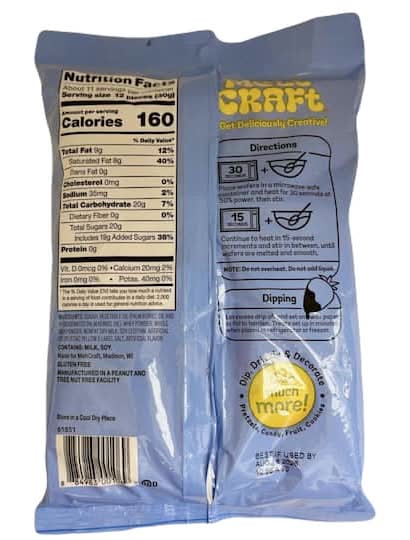 Easy to prepare in the microwave, these are perfect to drip, drizzle and decorate pretzels, candy, fruit, cookies and so much more. Contains milk and soy. Manufactured in a peanut and tree nut free facility. Gluten free. • Flavor: Vanilla • Color: Yellow