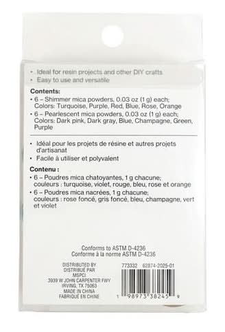 Purchase the Shimmer & Pearlescent Resin Powder Mix-Ins, 12ct. by Craft Smart at Michaels. Use the shimmer and pearlescent mica powder colors in resin jewelry, DIY coasters, trinket trays, and more. The shimmer colors included are Turquoise, Purple, Red, Blue, Rose, and Orange. The pearlescent colors included are Dark Pink, Dark Gray, Blue, Champagne, Green, and Purple. Shimmer and Pearlescent colors. 0.03 oz. (1 g) each. 12 pieces. Conforms to ASTM D 4236. Ideal for resin projects and other DIY crafts. Easy to use and versatile