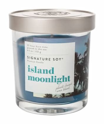 Buy the Signature Soy Jar Candle, 4.1oz. at Michaels. This jar candle is just what you need to lend a lovely, sweet scent to your space. Available in assorted scents. 4.1 oz. (115 g). 25 hour burn time. Plant based wax blend. Signature Soy Jar Candle, 4.1oz. Color: Island moonlight