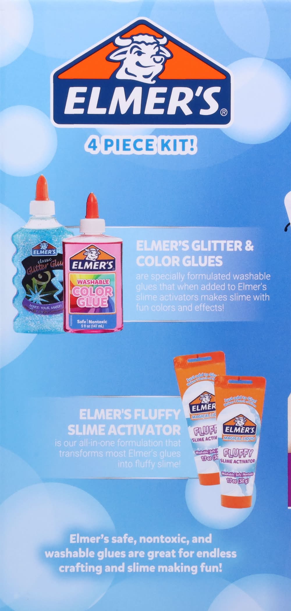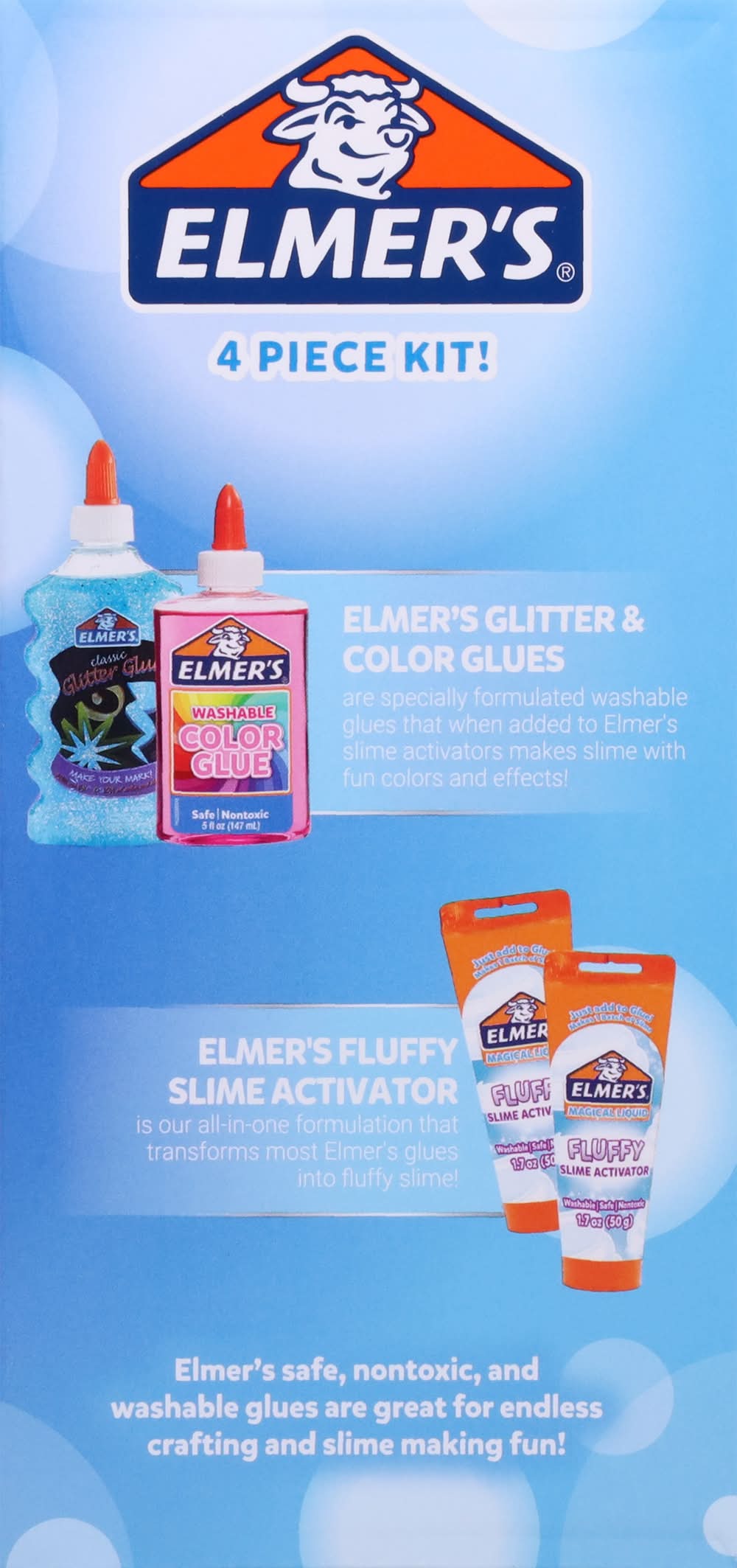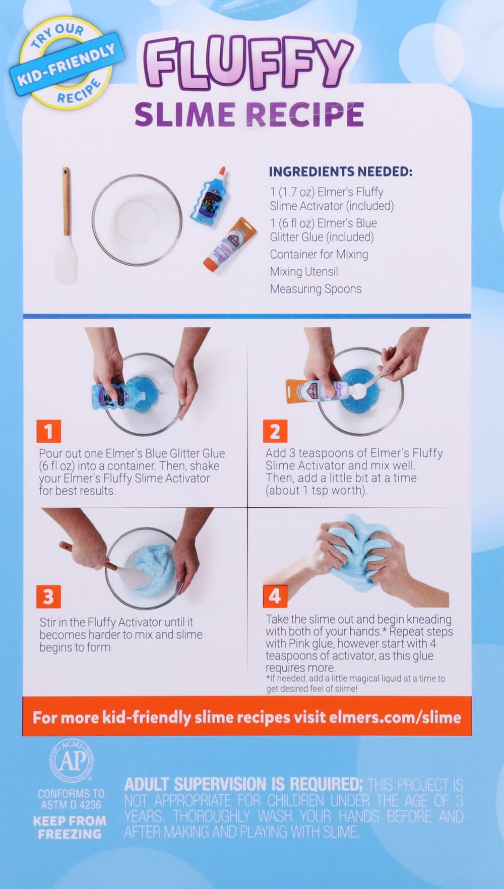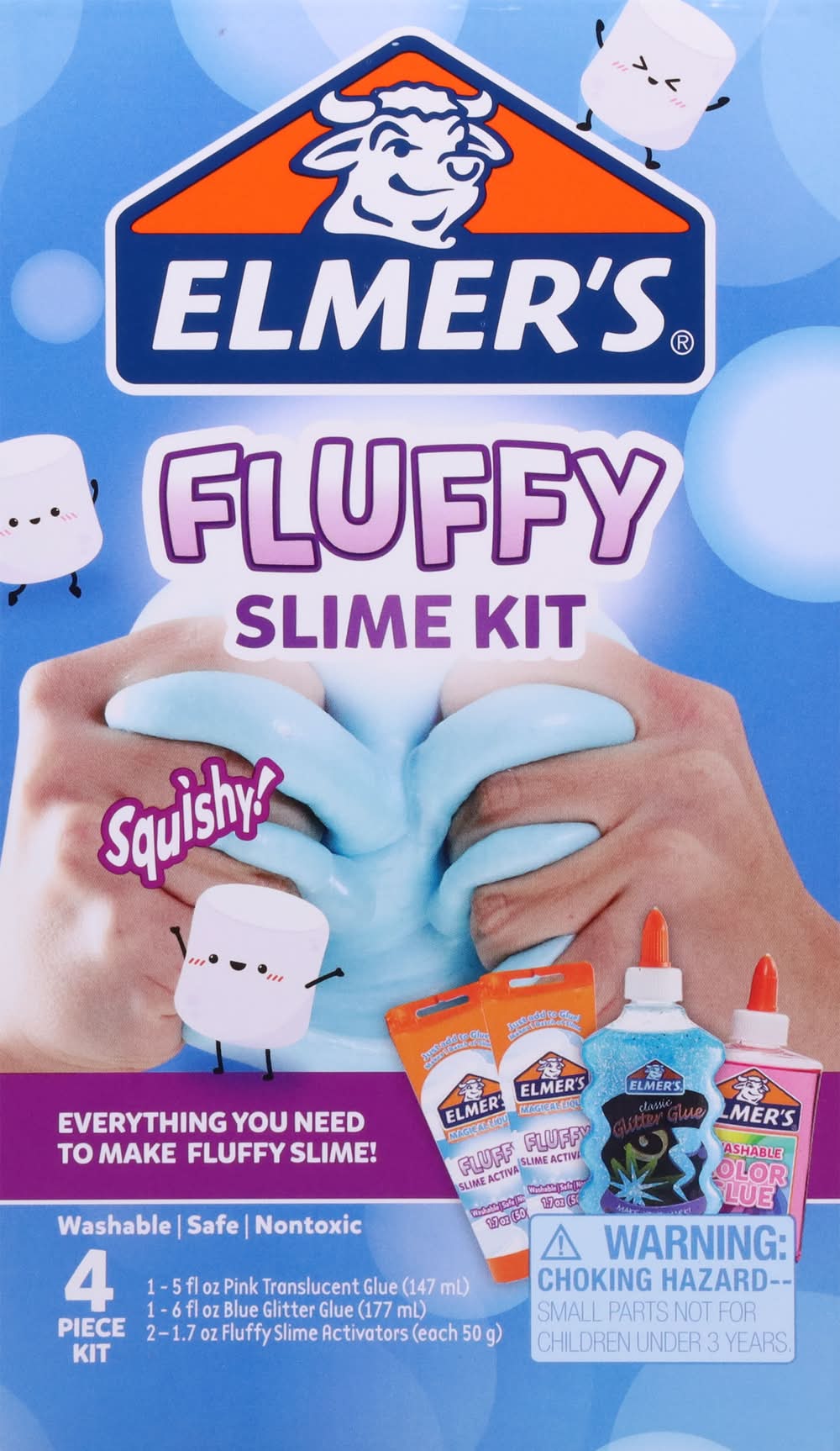 Purchase the Elmer's Fluffy Slime Kit at Michaels. With this slime kit, you have everything you need to make exciting fluffy slime!. 4 piece kit . Washable and nontoxic . Conforms to ASTM D4236. 2 Fluffy Slime Activators (1.7 oz./50 g) 1 Pink Translucent Glue (5 fl. oz./147 mL) . 1 Pink Translucent Glue (5 fl. oz./147 mL) 1 Blue Glitter Glue (6 fl. oz./177 mL). Elmer's Fluffy Slime Kit Color: Blue/pink