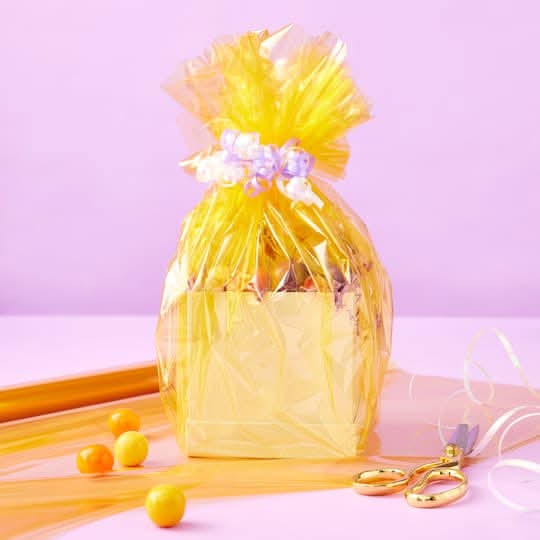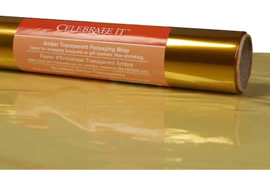 Find the Transparent Packaging Wrap by Celebrate It at Michaels. Simply wrap your basket, gather the plastic at the top and tie with a pretty ribbon or twist tie. Available in multiple colors. 30" x 25ft. (62.5 sq. ft.) . Non-shrinking. Transparent cellophane Color: Amber