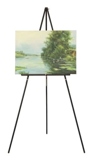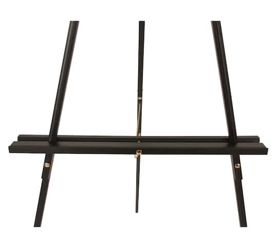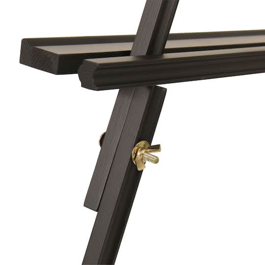 Available in classic black, this lightweight, pine easel features an adjustable tray, rubber feet and a leg chain for added stability, and its portability means you can take it on location to show off your best work.. Non-skid rubber feet. Lightweight for easy storage and transport. Instructions included. Pinewood with brass plated hardware . Easy assembly required. • Color: Black • Size: 67 in