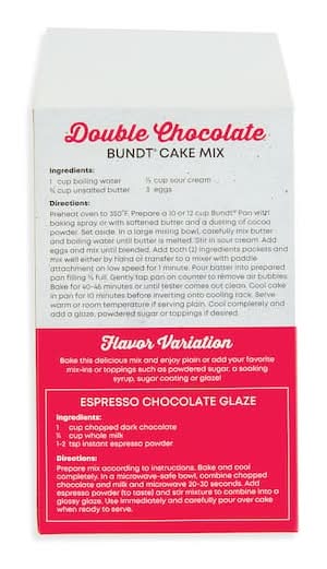 Find Nordic Ware Double Chocolate Bundt Deluxe Cake Mix at Michaels. Made with only the highest quality ingredients, this cake mix is perfect for any chocolate lover and is easy to make. Just add water, butter, sour cream and eggs with the mix for the ultimate treat! Double chocolate flavor. 28.5 oz. (807 g). Makes a 10-12 cup Bundt cake . Nordic Ware Double Chocolate Bundt Deluxe Cake Mix