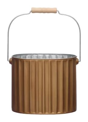 Buy the 6" Gold Ribbed Metal Bucket by Ashland at Michaels. Attractive, yet simple and functional, this gold bucket is made of galvanized iron, perfect for storing craft supplies or line with a richly hued cloth and fill with rose and magnolia stems for a lovely autumn table display. Gold colored. 8" x 5.4" x 6" (20.3cm x 13.7cm x 15.2cm). Not food safe. Galvanized iron and wood. For indoor decorative use only