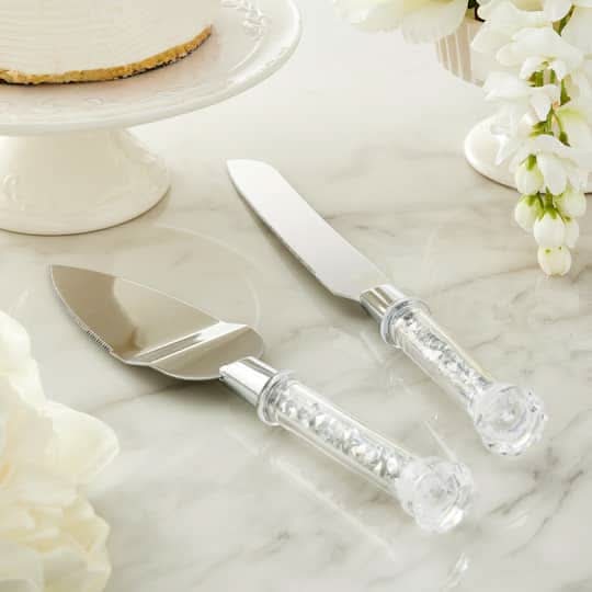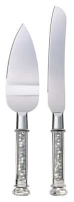 This stylish bling knife set is perfect for serving wedding cake. Stainless steel and acrylic. 10.43" x 2.05" x 1.1" (26.49cm x 5.207cm x 2.794cm) server knife11.6" x 1.06" x 1.1" (29.46cm x 2.69cm x 2.7cm) knife Color: Silver with bling embellishments