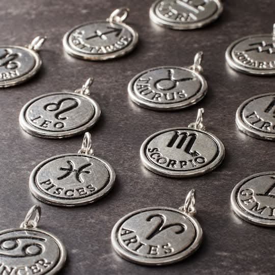 Purchase the Rhodium-Colored Zodiac Charm Set by Bead Landing at Michaels. Decorate bracelets, necklaces and other such jewelry accessories with these zodiac charms. Each charm has a zodiac sign inscribed on it, so you can personalize your jewelry craft projects with your sign.. 12 charms . Nickel free . Zinc alloy and iron Color: Rhodium
