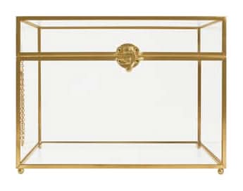 Purchase the Gold Metal & Glass Card Box by Celebrate It at Michaels. Add this glass card box to your special occasion. Perfect for placing on a table at a wedding, baby shower, birthday or other celebrations so your guests can set their thoughtful cards safely inside. Gold colored metal with clear glass. 5.5" x 10" x 7.75" (13.97cm x 25.4cm x 19.68cm). Brass and glass • Color: Gold • Size: 5.5" x 10" x 7.75"
