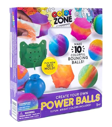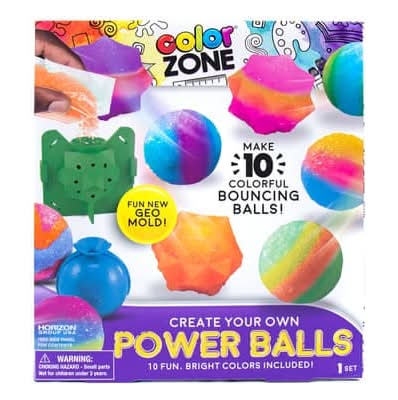 Purchase the Color Zone Create Your Own Power Balls at Michaels. This kit includes everything kids need to create high bouncing bouncy balls! All they have to do is mix and layer their favorite colors in the mold to create one-of-a-kind colorful balls. Makes 10 colorful bouncing balls. For ages 6 and up . 10 bags of ball making powderHexagon ball making mold. Hexagon ball making moldSpiky ball making mold. Spiky ball making moldRound ball making mold. Round ball making moldEasy-to-follow instructions . Color Zone Create Your Own Power Balls Color: Assorted