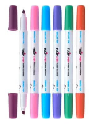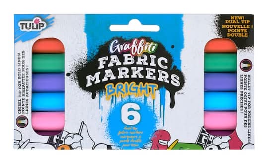 Purchase the Tulip Graffiti Fabric Markers Bright at Michaels. Bring home these markers from Tulip to add a pop of vibrancy to your fabric craft projects. Includes assorted colors. 5.5" x 3.9" x 0.63" (13.97cm x 9.9cm x 1.6cm) package size. 6 fabric markers. Dual-tip (chisel tip and bullet tip). Permanent. Machine washable. Tulip Graffiti Fabric Markers Bright Color: Assorted