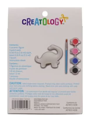 Buy the Color Your Own 3D Ceramic Dinosaur Kit by Creatology at Michaels. This kit will let your child turn a simple 3D ceramic dinosaur into a keepsake using their unique creative touch. Includes assorted colors . 4.02" x 2.05" x 5.82" (10.2cm x 5.2cm x 14.8cm) package size . For ages 8 and up . 1 ceramic 3D dinosaur 4 paint pots (0.06 fl. oz. (1.8 mL) each . 4 paint pots (0.06 fl. oz. (1.8 mL) each 1 brush . 1 brush Instructions