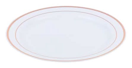 White with rose gold rim 7.5" (19.05 cm) plate diameter 10 plates Plastic Food safe Hand wash only - not dishwasher safe Do not microwave • Color: Rose gold-white • Size: 7.5"
