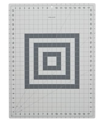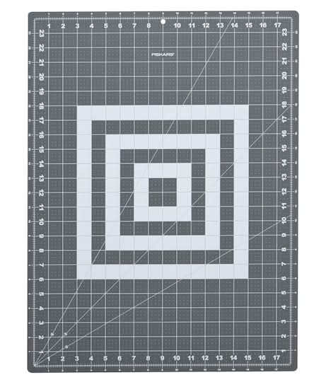 Fiskars Healing Rotary Cutting Mat is self-healing and double-sided, enhancing its durability and extending its usability. It features measuring grids and includes bias lines at various angles to assist in cutting complex shapes like triangles and stars. Designed specifically for tasks such as sewing, quilting, and scrapbooking, it is particularly adept at handling full widths of fabric directly from the bolt. The mat's high contrast colors facilitate the accurate cutting of both light and dark fabrics. For optimal longevity, it should be stored flat and kept away from extreme temperatures and direct sunlight. Color: Gray