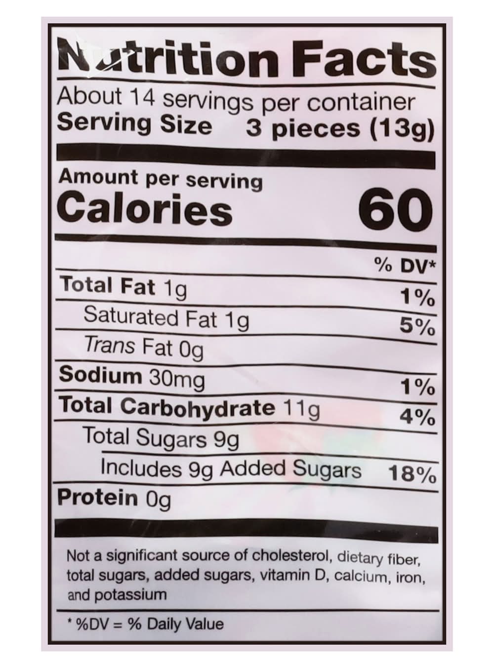 Ingredients: Sugar, Glucose Syrup, Coconut Oil, Cream (Milk), Glycerin, Salt, Titanium Dioxide (Color), Natural and Artificial Flavors, Soy Lecithin, Lactic Acid, Fruit Juice, Red 40 Contains: Milk, Soybeans