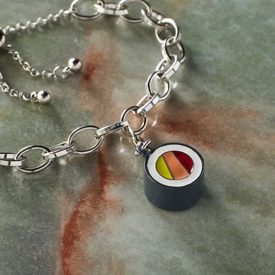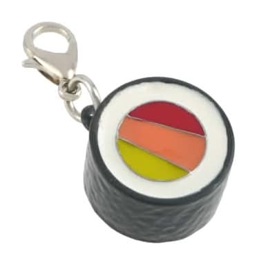 Add this fun sushi roll charm to your charm bracelet or DIY necklace. You can coordinate this adorable piece with beads, spacers, and other food or beverage related charms to create a unique and fun design. Silver lobster clasp with multicolor sushi charm. Nickel free . Zinc alloy, iron and enamel Size: 10 mm