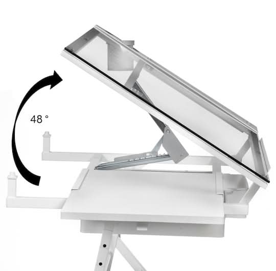 Find this Metal & Glass Artist Table by Artist's Loft at Michaels. This glass-top artist's table is the perfect workspace for arts and crafts projects, sketching, drawing, drafting and more. The tabletop tilts up to 48° to accommodate a variety of projects, bringing your work to you. Available in multiple colors. Clear glass top. 55.9" x 23.6" x 28.5" (142cm x 60cm x 72.4cm) overall dimensions. Powder coated matte finish. Assembly required, instructions included. Complies to TSCA Title VI Color: White